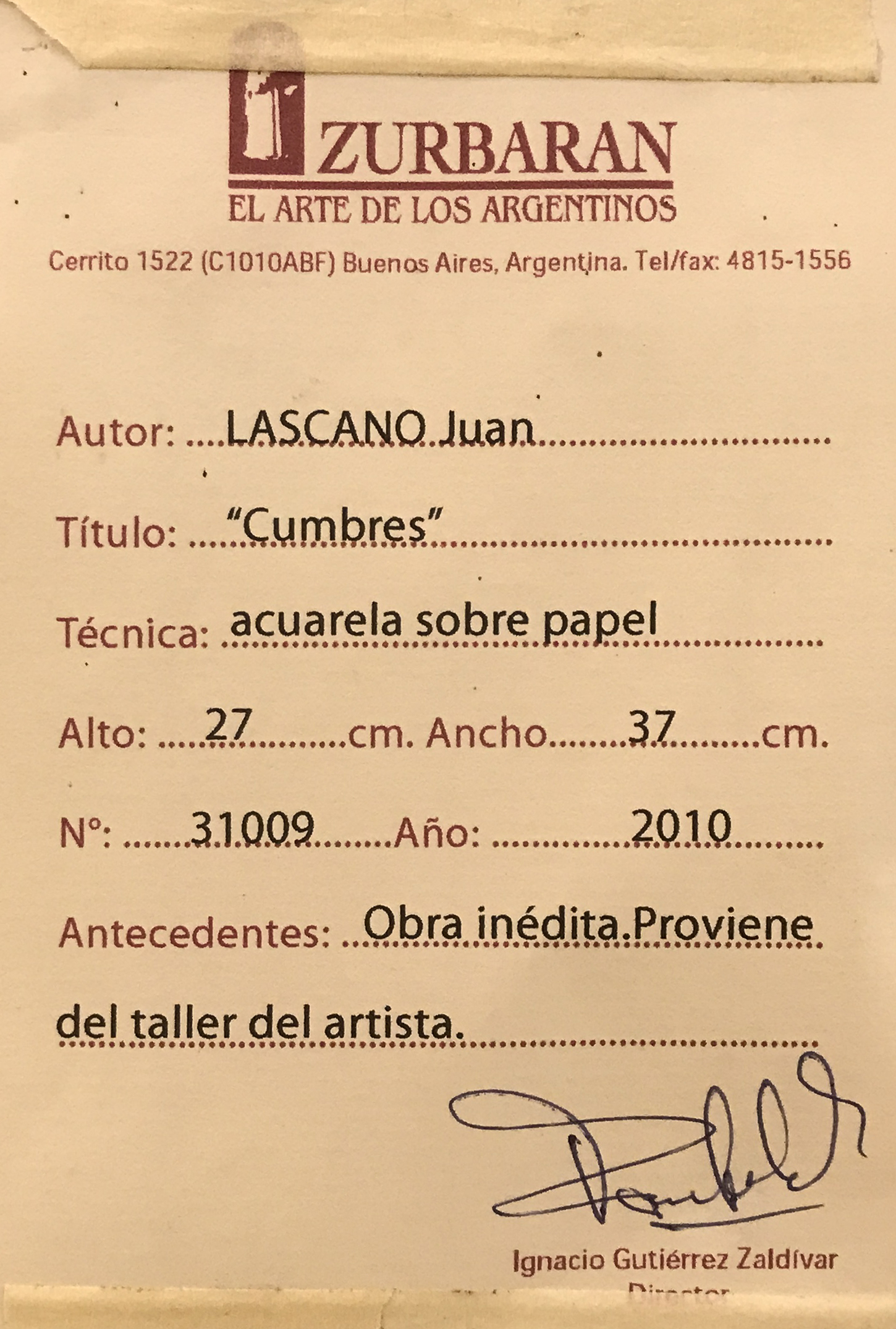 Al dorso posee certificado de autenticidad extendido por Galería Zurbarán.