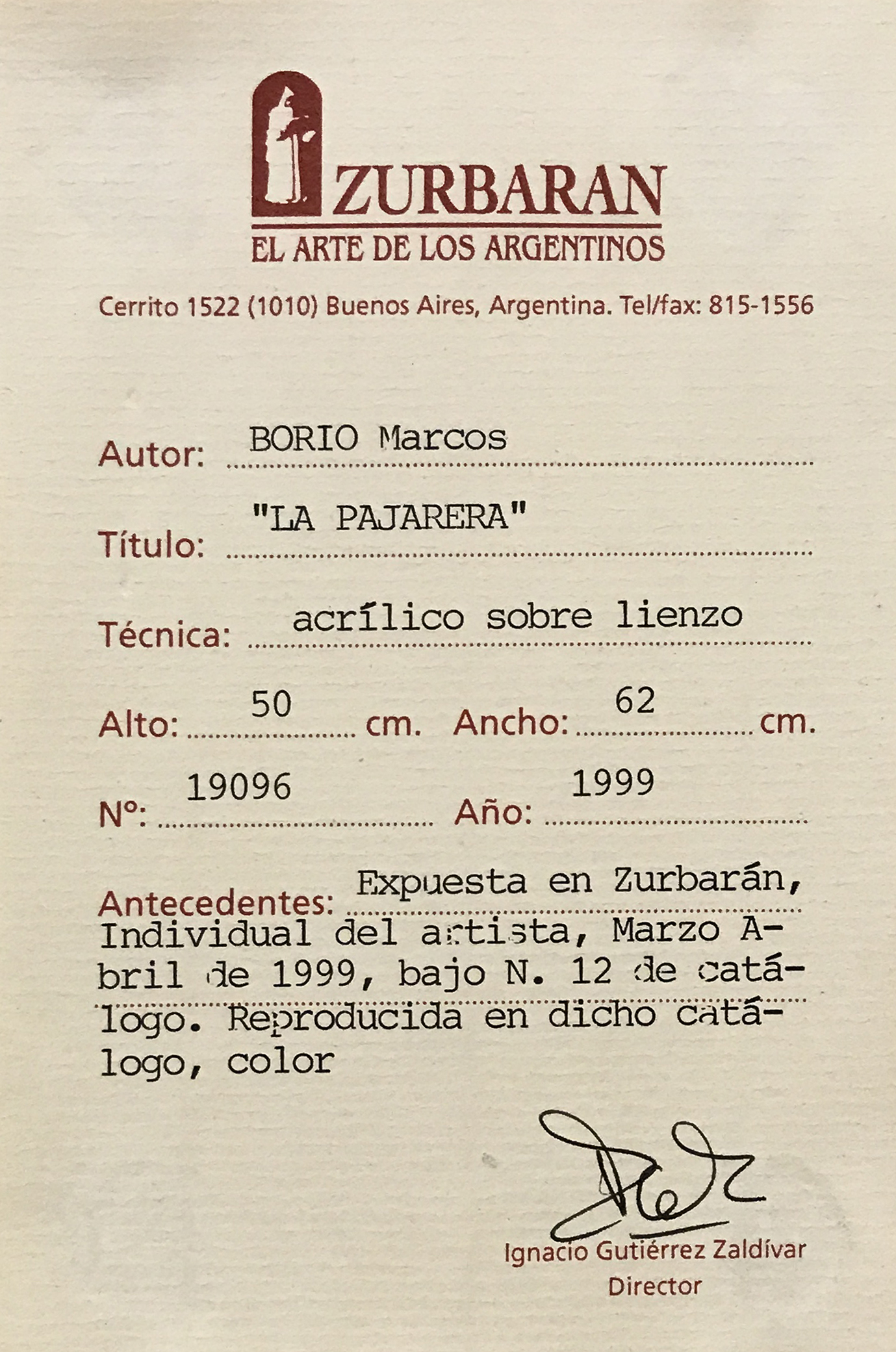 Firmado y fechado 1999 abajo a la derecha por el artista. Al dorso posee etiqueta de Galería Zurbarán.